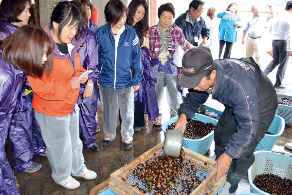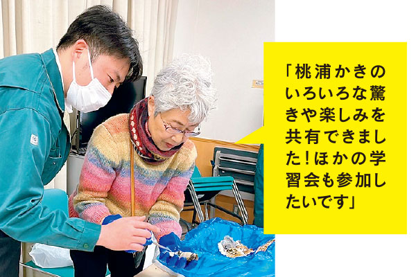 みやぎ生協・国見ケ丘店で行われた「めぐみ野」学習塾(桃浦かき)でのかきむきの様子