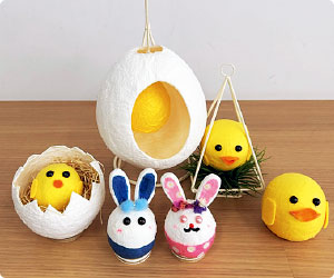 紙張り子でかわいい、卵、ひよこ、うさぎを作ります。お部屋や玄関に飾り、春の訪れを楽しみましょう。