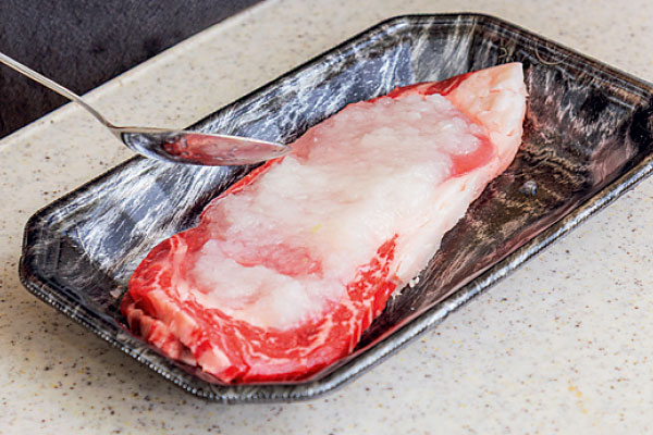 ② ステーキ肉は筋を切って、玉ねぎ半分をすりおろしたものを塗り30分以上置いておく(※1)。
