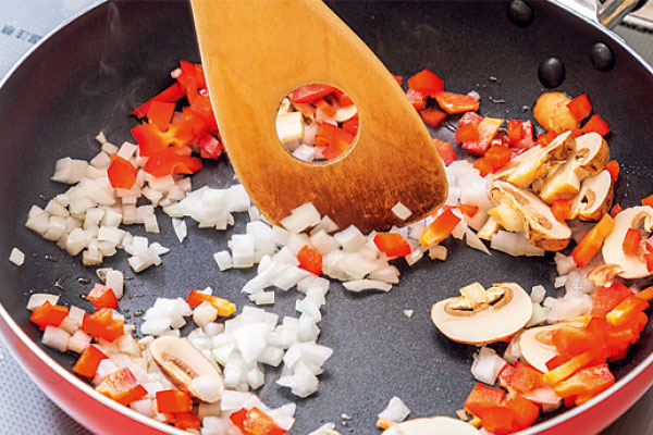 ③ 残りの玉ねぎ、パプリカは粗みじん切りに、マッシュルームは薄切りにする。