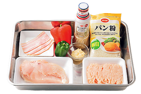 ② ボウルにひき肉、パン粉、マヨネーズを入れて手でこねる。