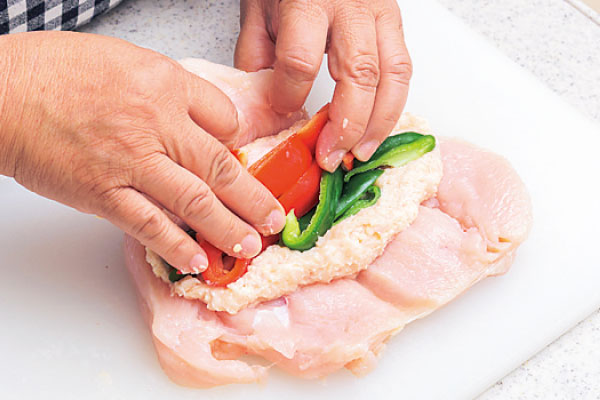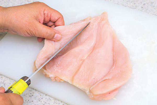 ① むね肉は厚さが均等になるように肉面に切り込みを入れて開く(※1)。