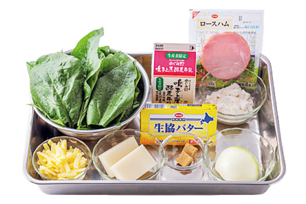 ① ほうれん草は茹でて3㎝幅に切る。玉ねぎは薄切り、ハムは2㎝の短冊切りにする。オープンを250℃に予熱しておく。