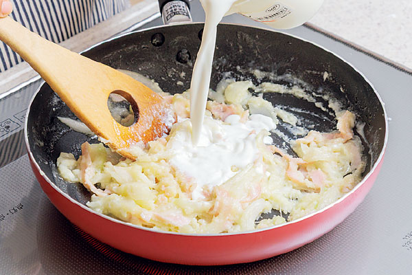 ② フライパンに中火でバターを熱し、玉ねぎ、ロースハムを炒める。玉ねぎが透き通ったら薄力粉を加えて弱火で焦がさないように炒める。(※1)