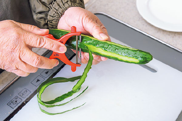 (※1)きゅうりは縞模様になるようにピーラーでランダムに皮をむきます
