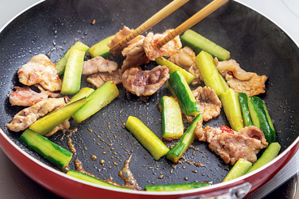 (※2)きゅうりと調味料を入れたら短時間で炒めて仕上げるのがポイント