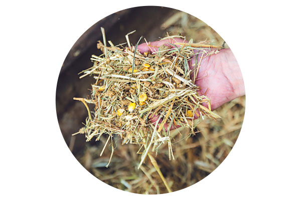自家生産の牧草と家畜用トウモロコシ、特注の配合飼料に飼料用米、乳酸菌などのハーブを配合