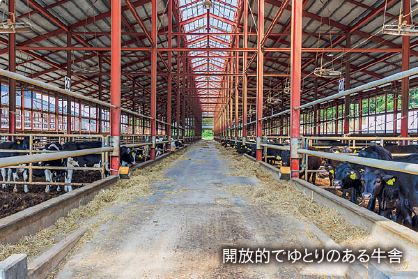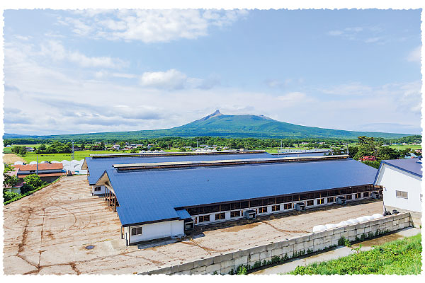 雄大な駒ヶ岳を望む牛舎は、涼やかな風が気持ちよく吹き抜ける小高い場所にあります。全27棟ある肥育牛舎では、約11,000頭を飼育。衛生面を一番に考慮した最新の設備で、ストレスの少ない環境のもと牛たちがのびのび成長できるよう、日々の健康管理に気を配っています。
