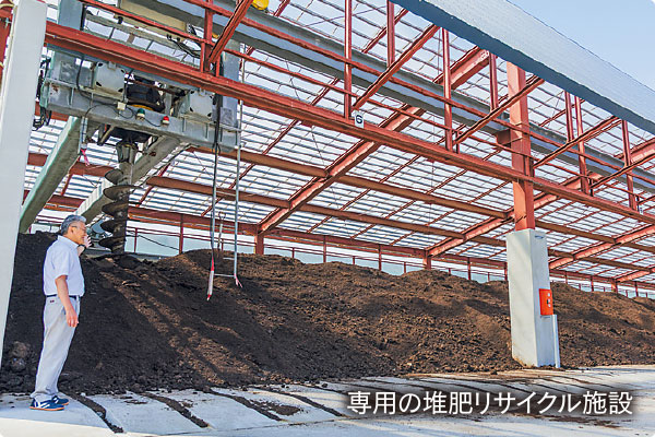 持続可能な生産体制と循環型農業として、東京ドーム90個分にもなる自家生産の牧草・家畜用トウモロコシの栽培や、堆肥リサイクルを行っています。牛たちの健康と腸内環境を整える乳酸菌がお肉のおいしさにつながるだけでなく、乳酸菌を食べた牛のふん尿は臭いが少なく、よく発酵するため良質な堆肥に。9棟ある専用の堆肥リサイクル施設で完熟堆肥化し、牧草などの栽培に活かすことで、食べる人にも環境にも優しい持続可能な生産体制を実現しているのです。