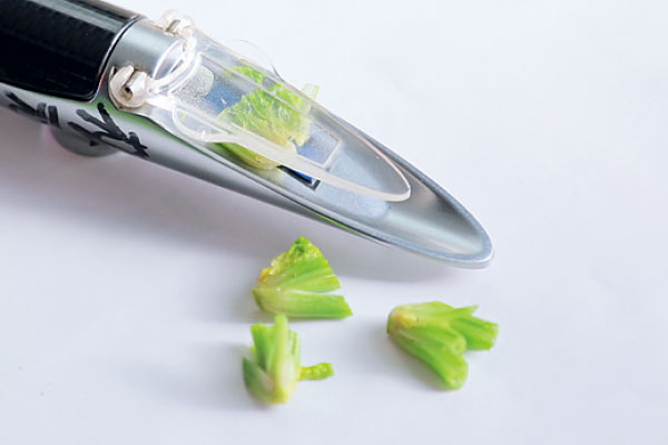 糖度計で根元をチェックし、9度を超えると出荷を迎えます
