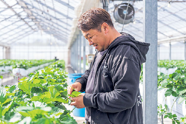 葉の様子からいちごの健康状態をチェック。いちごにとっての最良の環境を整えるため、日々知識と経験をアップデートし生産に反映しています