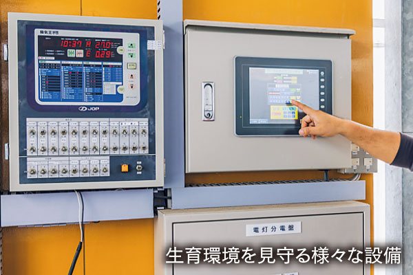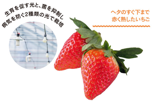 甘くみずみずしい「めぐみ野」いちごは、赤く熟してから摘み取ることで、おいしさをそのままにお届けしています。甘みが強い王道人気のとちおとめを中心に、昨年から宮城県生まれの品種「にこにこべりー」「もういっこ」の2品種も「めぐみ野」として取り扱いスタート。農薬・化学肥料を減らしながら、おいしいいちごを実現するための工夫を凝らした栽培方法を導入しています。病害虫・雑草の発生を抑えるための取り組みも強化し、二酸化炭素の活用や防虫効果のある天然の植物油を活用しています。さらに2種類のランプを使用することで、元気な生育を助け病気を抑える取り組みも。「少しの条件の違いで味わいが変わるため、目指すおいしさを一定に保つのが難しいですね」と髙瀬さん。試行錯誤を繰り返し積み上げた経験が、おいしいいちごの生産につながっているのです。