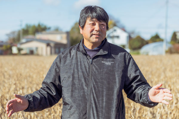 「めぐみ野」あぶらげの原料となる「めぐみ野」大豆の生産に携わる秋山さんは、この道21年の大ベテラン。大豆栽培を父から受け継ぎ、現在は登米市豊里町の9組合で構成される「豊里町転作集団連絡協議会」の生産者約30人とともに、あぶらげに適した大豆タチナガハの生産に情熱を注いでいます。