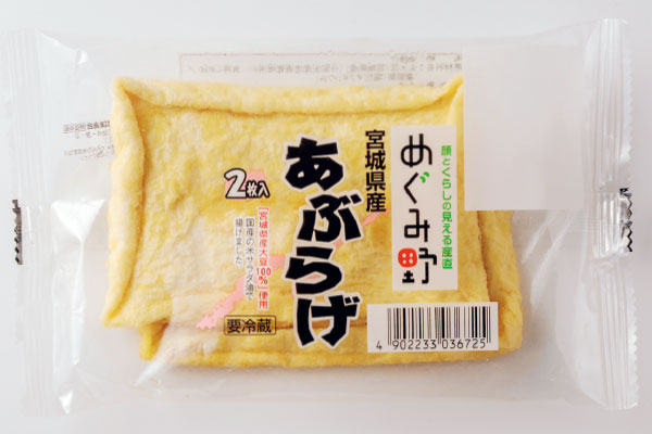 宮城県登米市豊里町で栽培されている大豆「タチナガハ」を100%使用した、しっとりとやわらかい「めぐみ野」宮城県産あぶらげ。