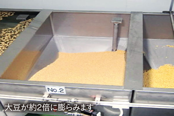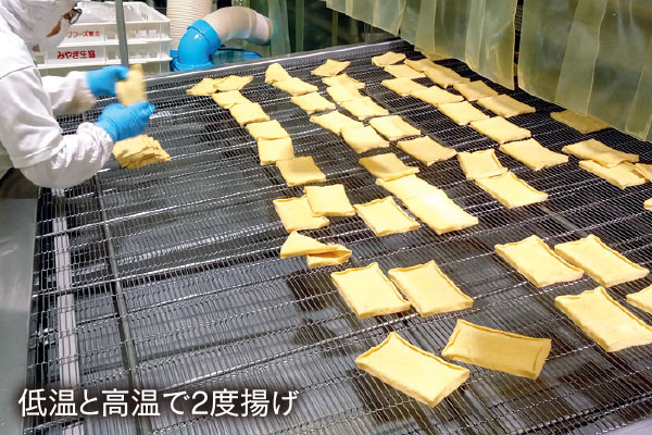 あぶらげの仕上がりを左右する、最も重要な豆の浸漬工程。熟練の経験で季節や水温、大豆の状態により日々浸漬時間を微調整します。その後大豆をすり潰し、煮釜で4分煮込み、豆乳とおからに分け生地を成形します。その生地をフライヤーを使い低温、高温で2度揚げし、おいしさを閉じ込めます。