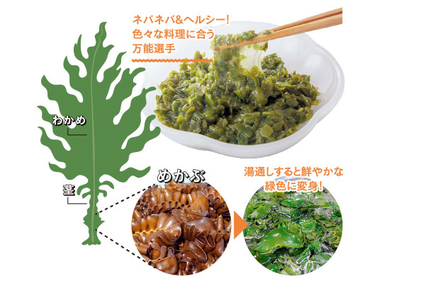 めかぶはわかめの根元に近い、肉厚でフリルのようなひだの多い部分。食物繊維、ビタミンB、カルシウム、ミネラルが豊富な優秀食材です