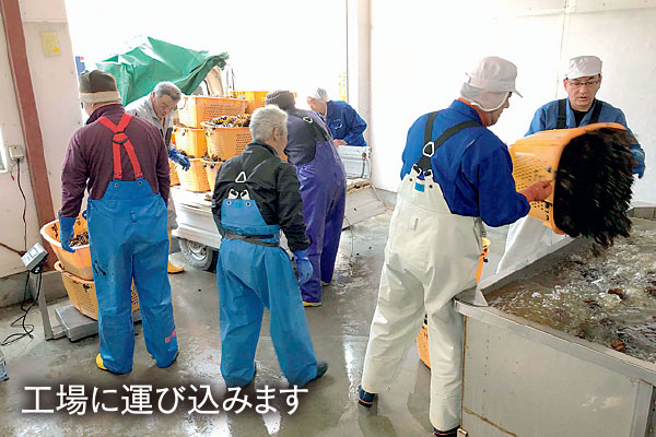 種付けから約90日で水揚げを迎えるめかぶは冬から早春が旬。11月に種付け、12月〜1月にかけて間引きを行い、天候を見極めながら2月〜4月にかけて刈り取ります。刈り取りは夜中2時頃から始まる、寒さと体力勝負。一人の漁師が一日に収穫する量は約500キロ〜1トンにもなります。