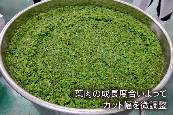 浜では生産者が一丸となり、専用の道具を使用してめかぶのひだ部分を切り離します。その後、品質を厳しくチェックし工場へ。90℃以上の熱湯で素早く湯通しし、めかぶの食感を最大限に活かす独自カットで細かく刻みます。原料が工場に届きパック詰めされるまでの時間はなんと約1時間!浜全体と工場の連携が、鮮度抜群のおいしさを実現しています。