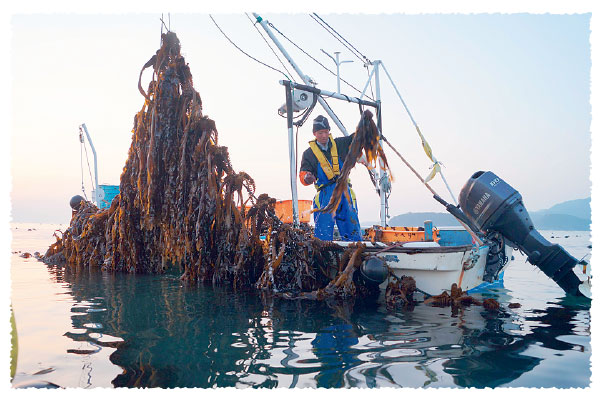 北太平洋に面し三陸海岸の南部に位置する志津川湾は、親潮・黒潮・津軽暖流の3つの海流がバランスよく影響し合う、栄養豊富な海域です。さらに、7つの川から流れ込む山々のミネラルも加わり、肉厚でやわらかい、食物繊維たっぷりのめかぶが育ちます。「志津川湾のめかぶは安定して水揚げできるため、漁師たちの収入基盤にもなっています」と三浦さん。生育期間から収穫まで水温が安定していることが上質なめかぶのカギになりますが、近年では海水温の上昇や突然の大雨など、環境の変化が問題視されています。各地でめかぶの品種や生育の研究をしてきた三浦さんは、「冬が養殖のピークのめかぶにとって、水温の上昇は天敵。種苗の元となる胞子や種が落ちてしまう原因になります」と話します。そうした局面を長年の経験と知識により乗り越え、おいしさと品質にこだわっためかぶを作り続けています。「後悔のない養殖をしたい」と、今日も海に向かいます。